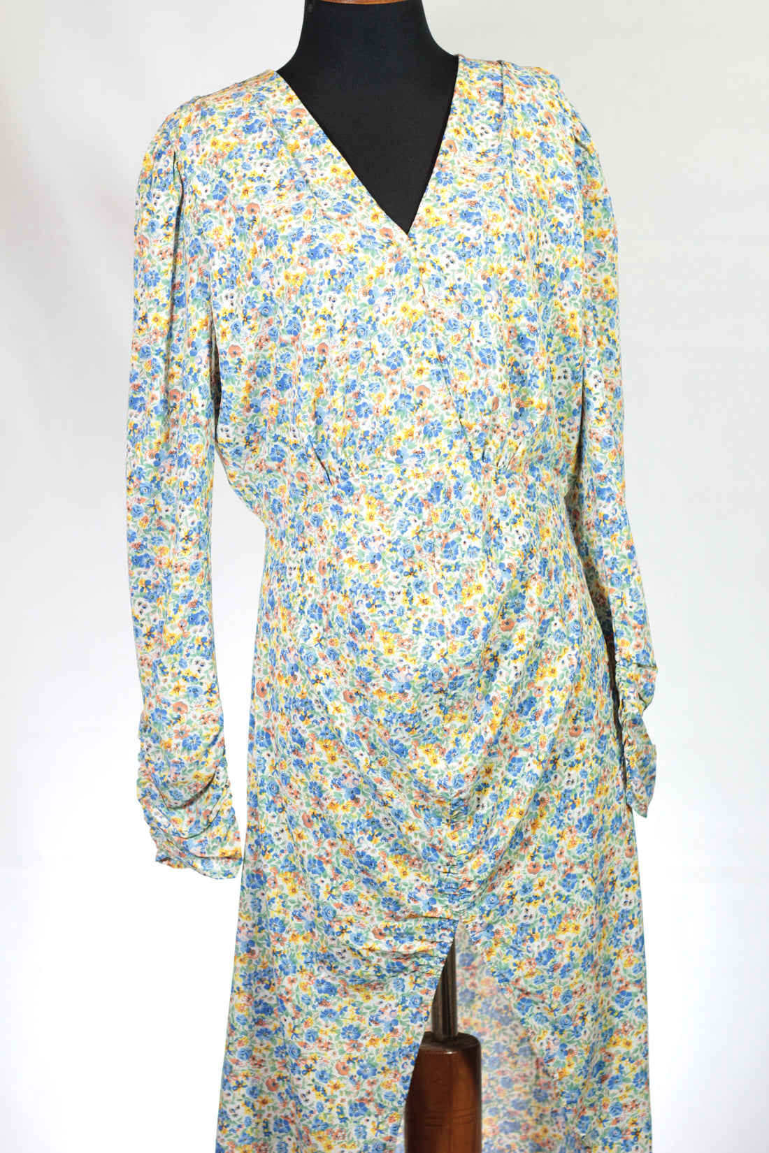 A sophisticated navy blue and white floral-patterned dress with elegant bell sleeves and a flattering...