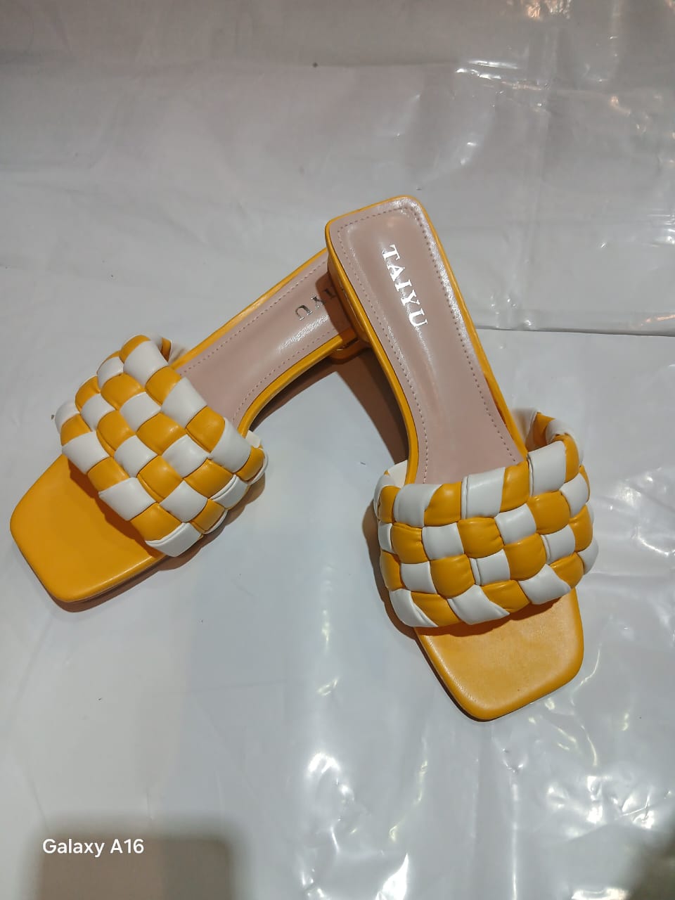 Yellow & White Woven Strap Sandals – Square Toe, Slip-On Mules