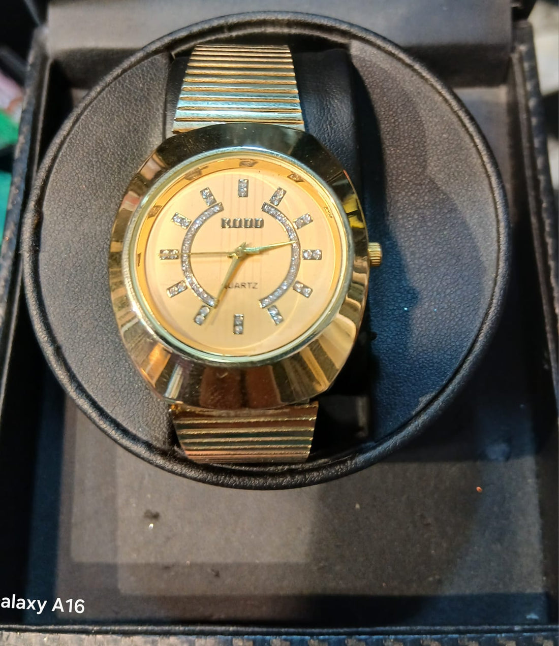 Description A classic, elegant timepiece featuring a gold-tone round bezel, white/silver dial with baton-style markers,...
