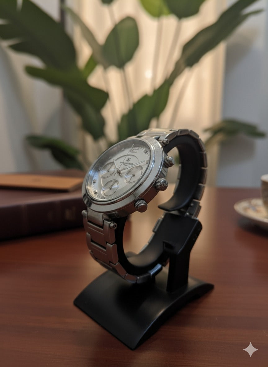 Description:A bold, two-tone-inspired dress/sport watch with a silver dial, multiple sub-dials for a chronograph look,...