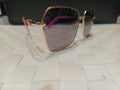 Step into the spotlight with these elegant square sunglasses featuring a sleek gold metal frame and soft grey-tinted lenses. The thin temples and minimalistic design create a high-end, fashionable look that's both trendy and timeless. The pink ear tips add a fun pop of color, giving a youthful twist to a classic design. Perfect for elevating your everyday outfit or adding charm to your vacation wardrobe.