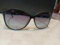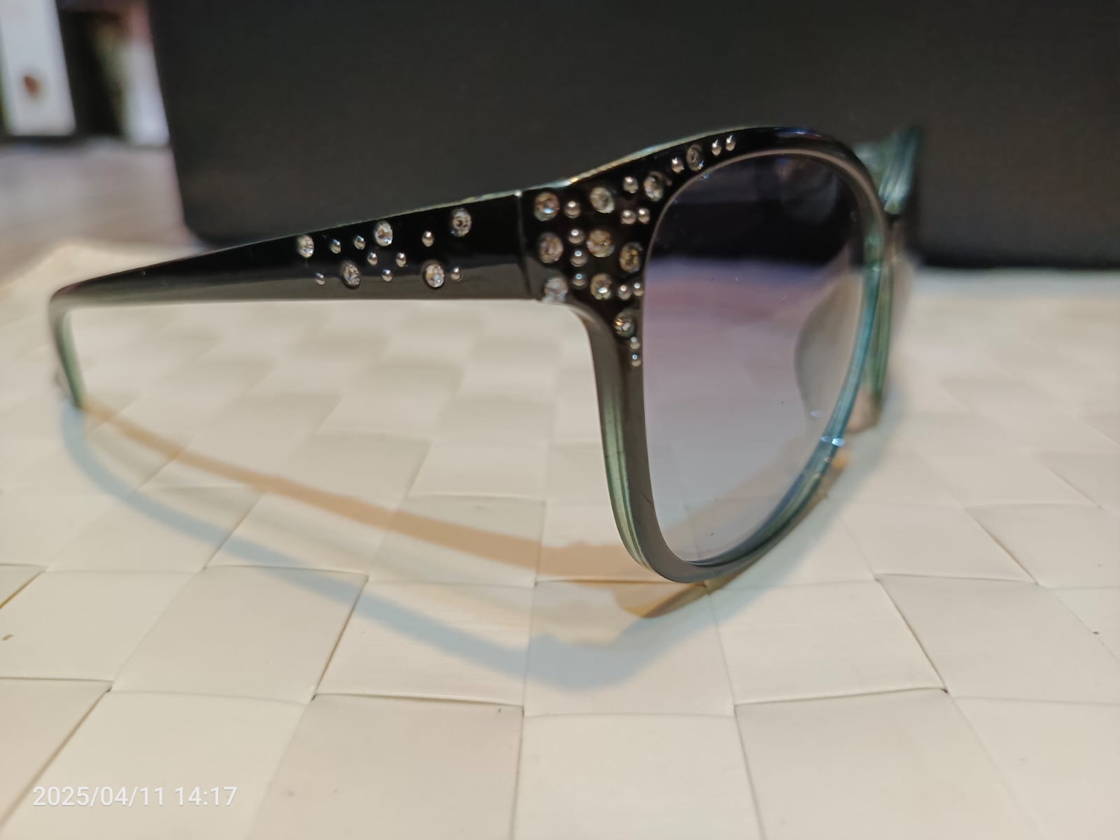 This image showcases a stylish pair of women's sunglasses with a bold black frame and gradient lenses. The frame is adorned with elegant rhinestone detailing on the temples and corners, adding a touch of sparkle and glam. The photo is taken on a woven white surface, which enhances the contrast and makes the sunglasses stand out.