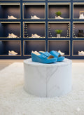 Stylish and comfortable blue slip-on sandals featuring a wide strap with a bold square buckle, ideal for casual daily wear, at home, or light outings.