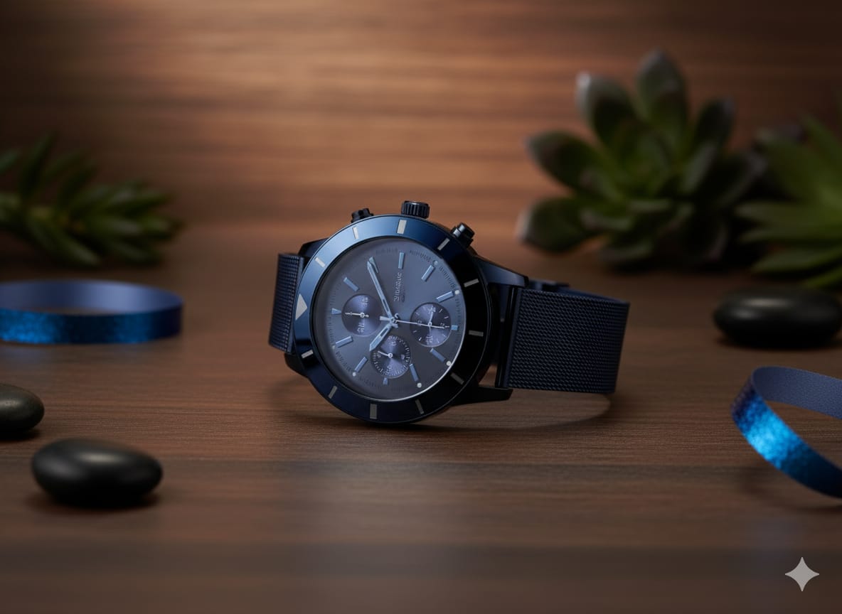 Sleek and modern chronograph watch with a deep blue case and mesh strap. The multi-function dial features sub-dials and clean index markers, making it a versatile accessory for both business attire and casual looks. A refined, contemporary timepiece that adds a touch of elegance to any outfit.