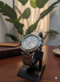 A bold, two-tone-inspired dress/sport watch with a silver dial, multiple sub-dials for a chronograph look, and a robust stainless steel bracelet. The large case and polished finish give it a modern, statement-making presence suitable for casual to smart-casual outfits.