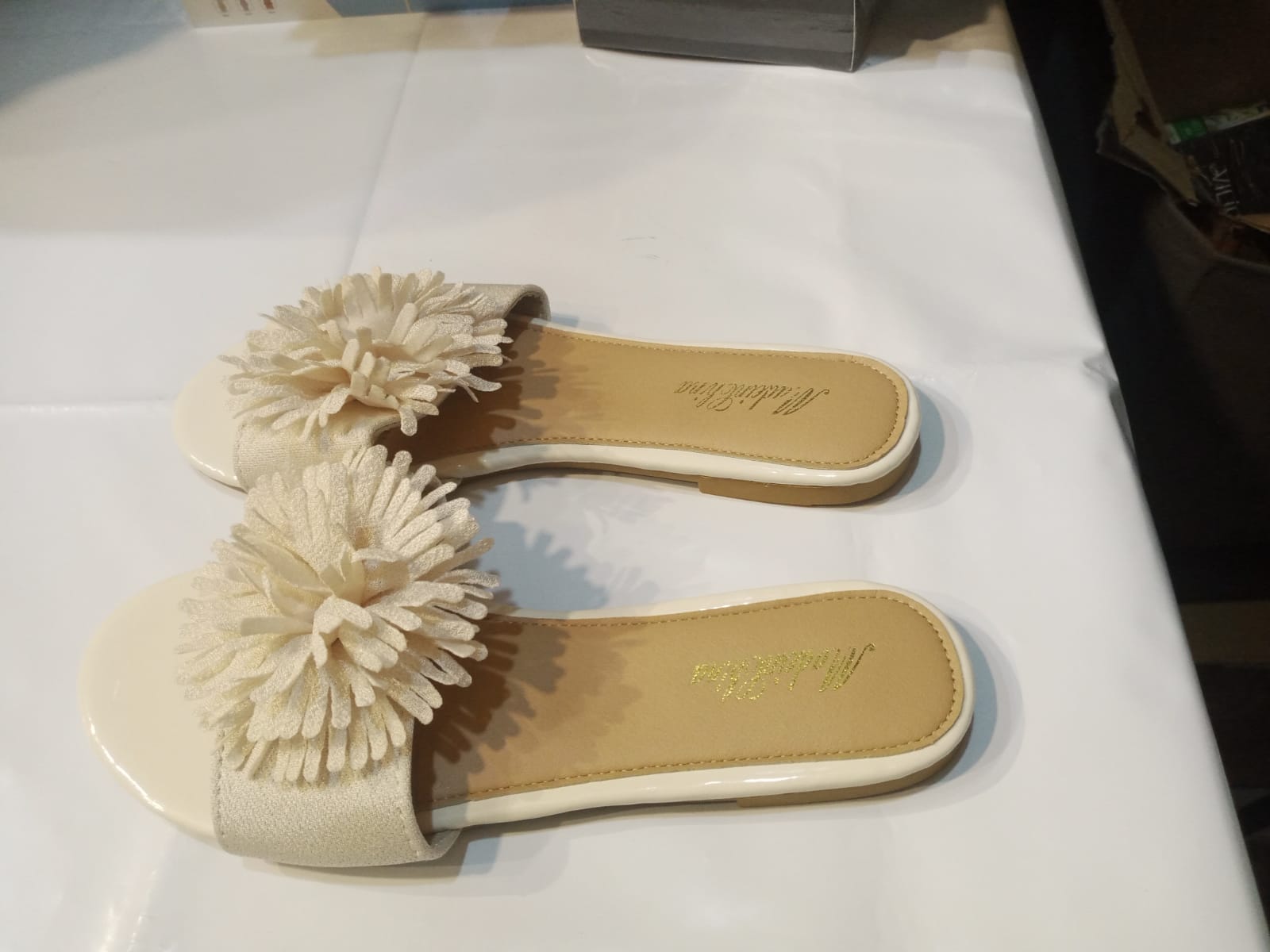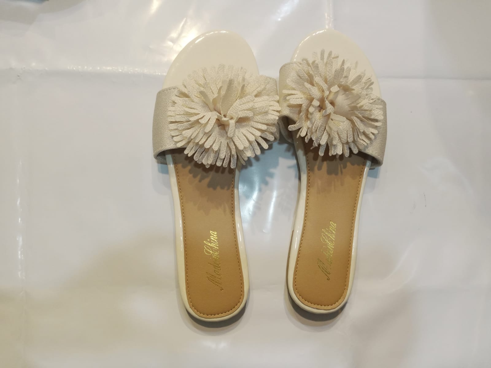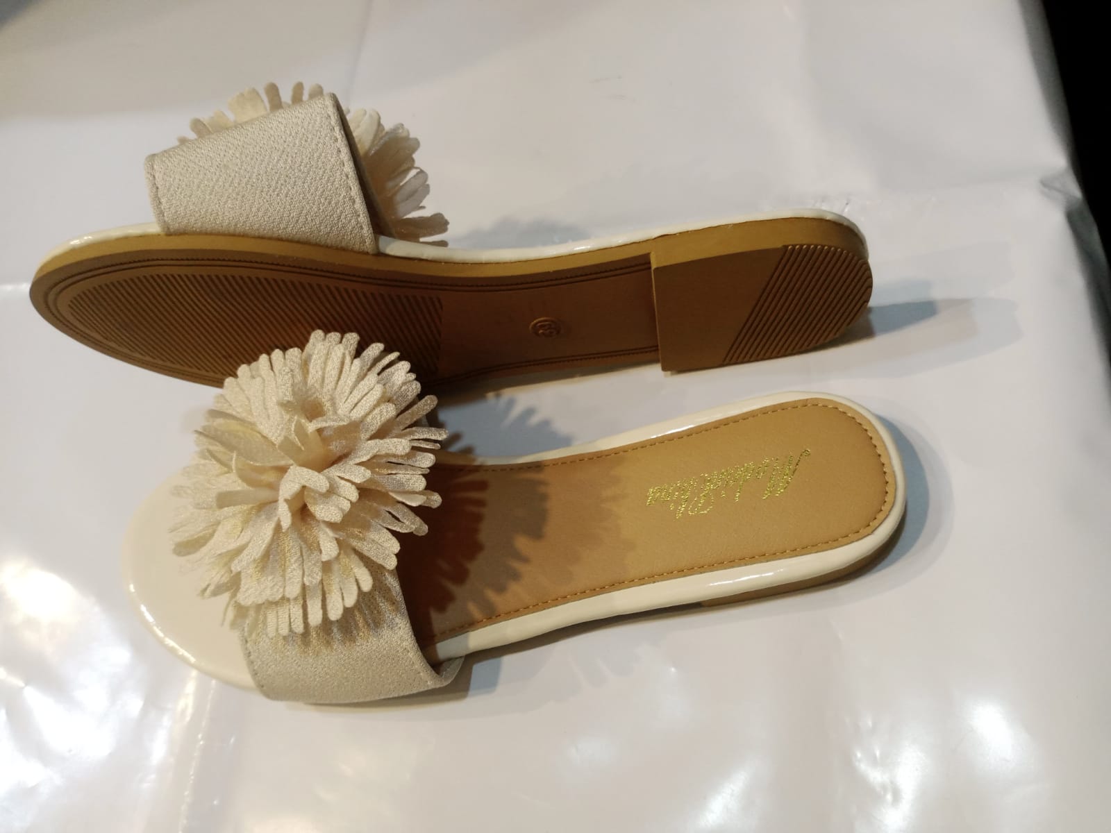- Design: Beige color with fabric flower and tassel embellishment on the vamp