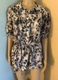 A chic floral button-down tunic with a cinched waist, perfect for a stylish yet comfortable look.