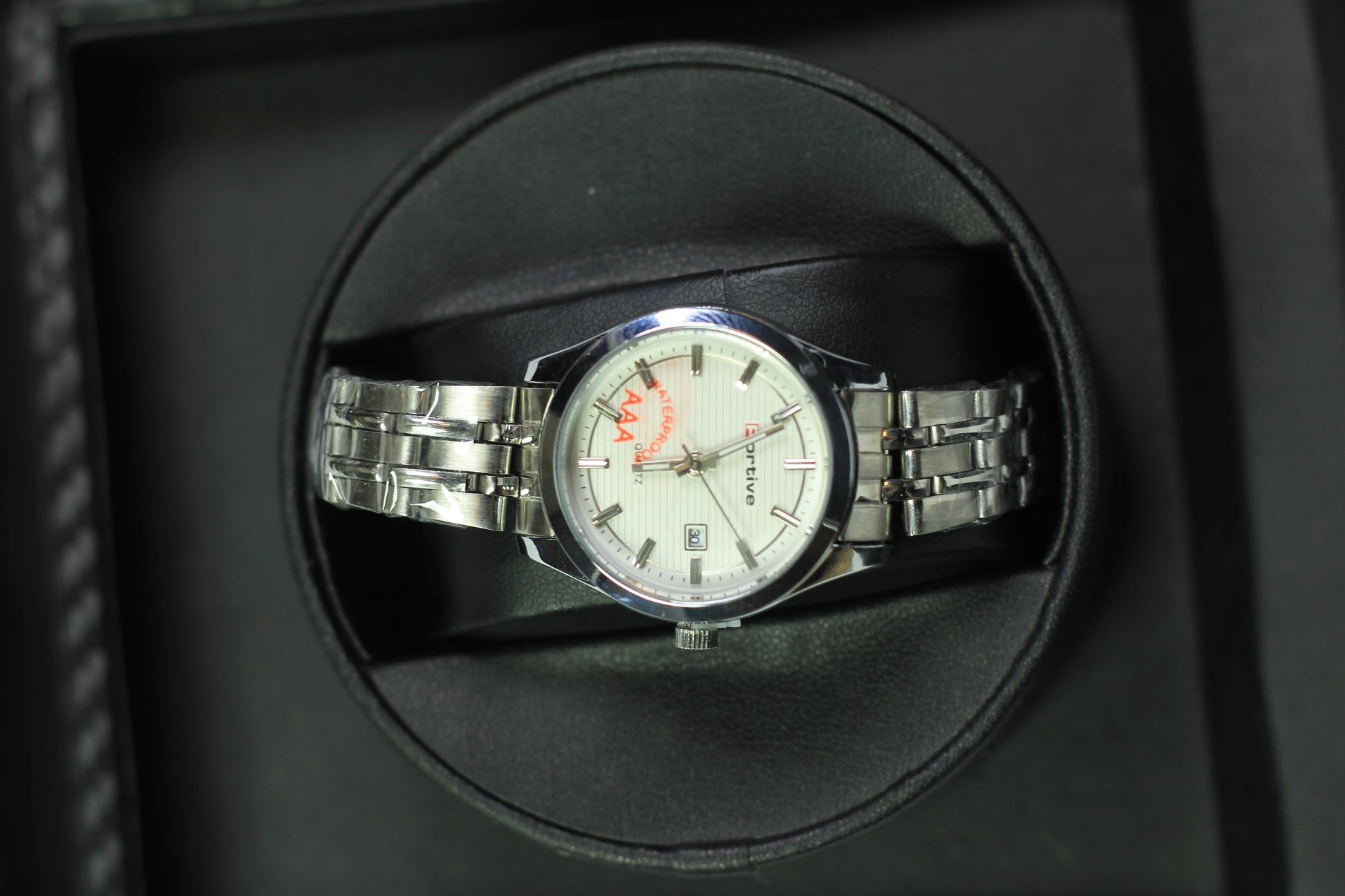 * This is an original and imported Sporturn watch. It features a sleek silver-tone case and bracelet, a classic white dial with luminous hands and markers, and a date window. This is a sophisticated timepiece, crafted with premium materials and attention to detail.