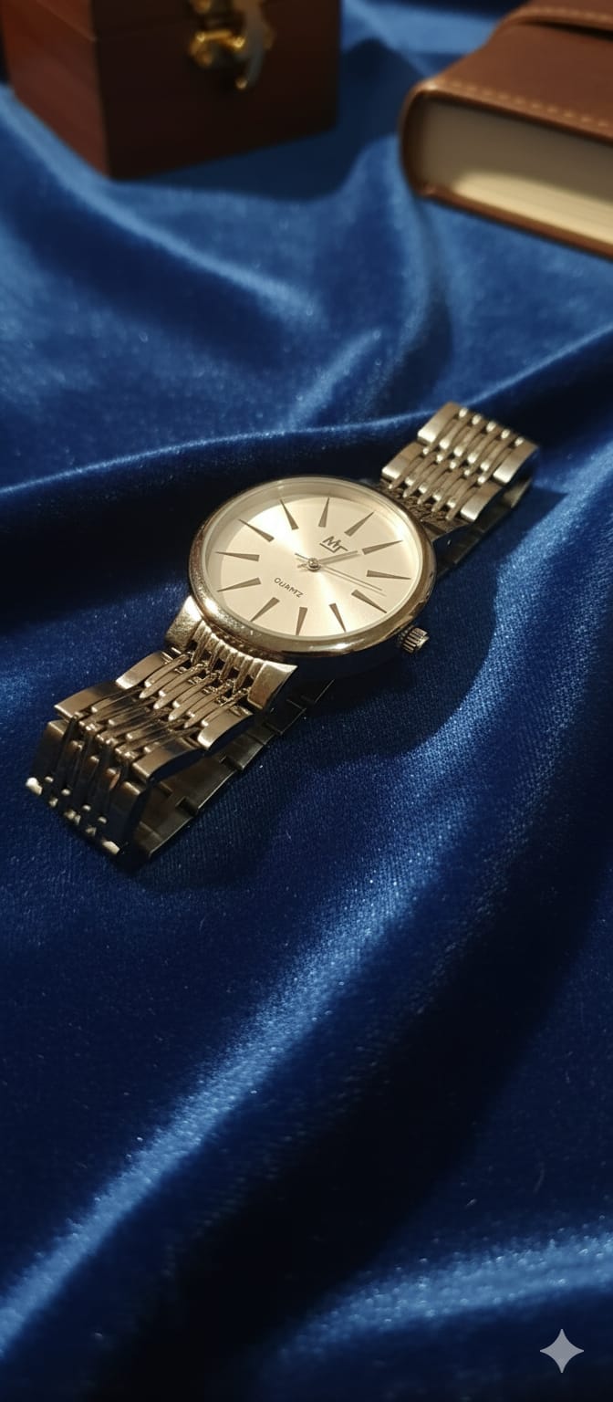 - Dial: Silver-tone with applied baton indices, three hands (hour, minute, seconds)