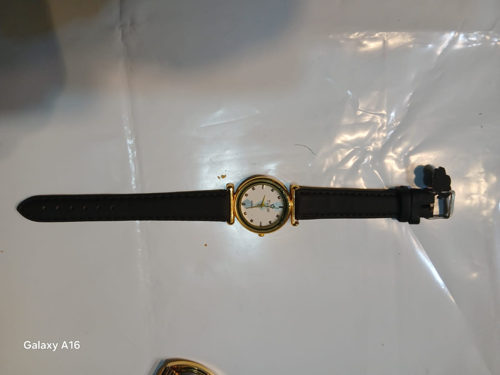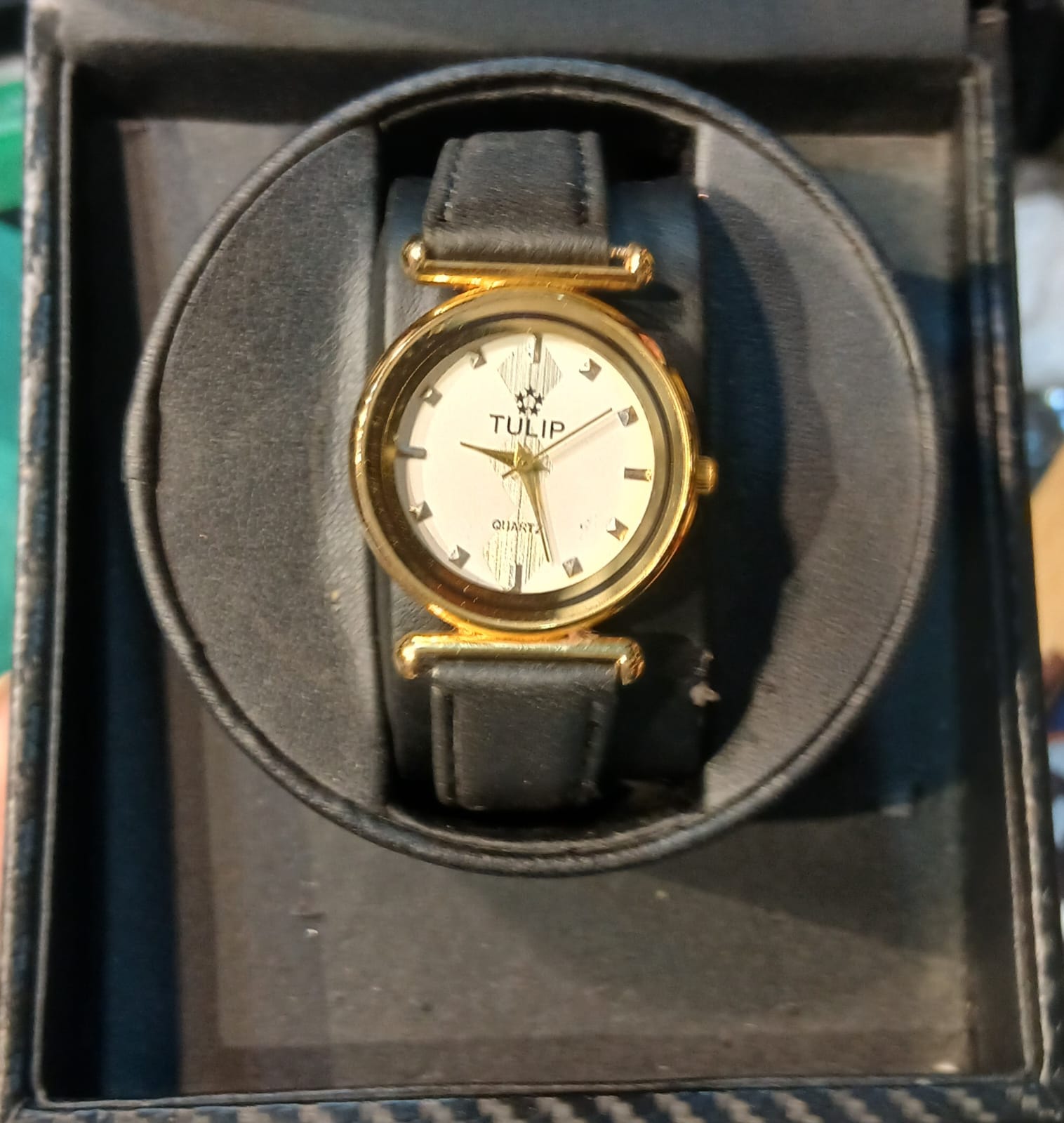 A classic, elegant timepiece featuring a gold-tone round bezel, white/silver dial with baton-style markers, and a black leather strap. The brand logo “TULIP” is printed on the dial. The overall look is formal and suitable for dress wear or smart-casual outfits.