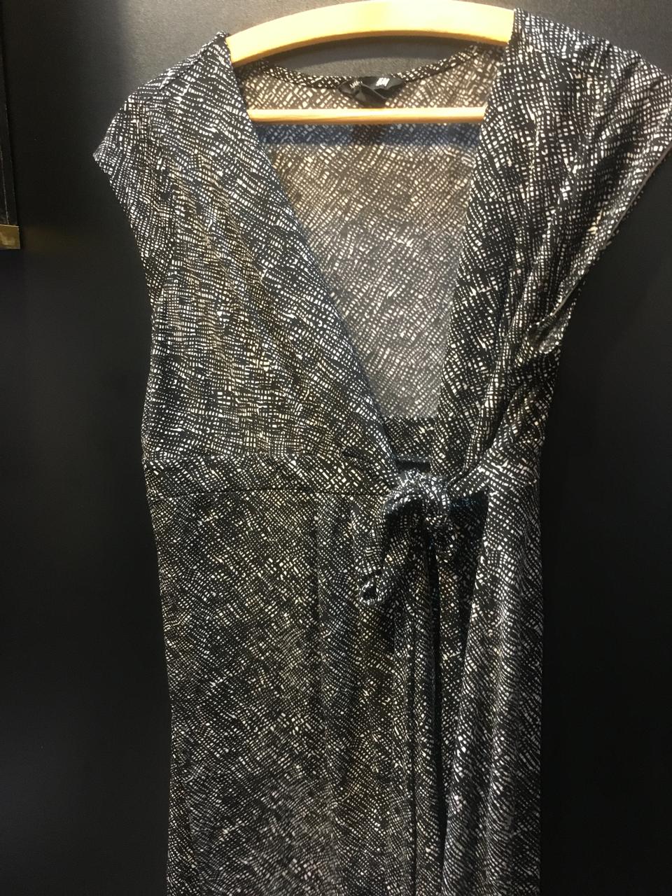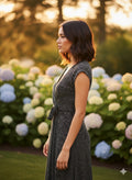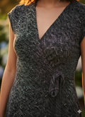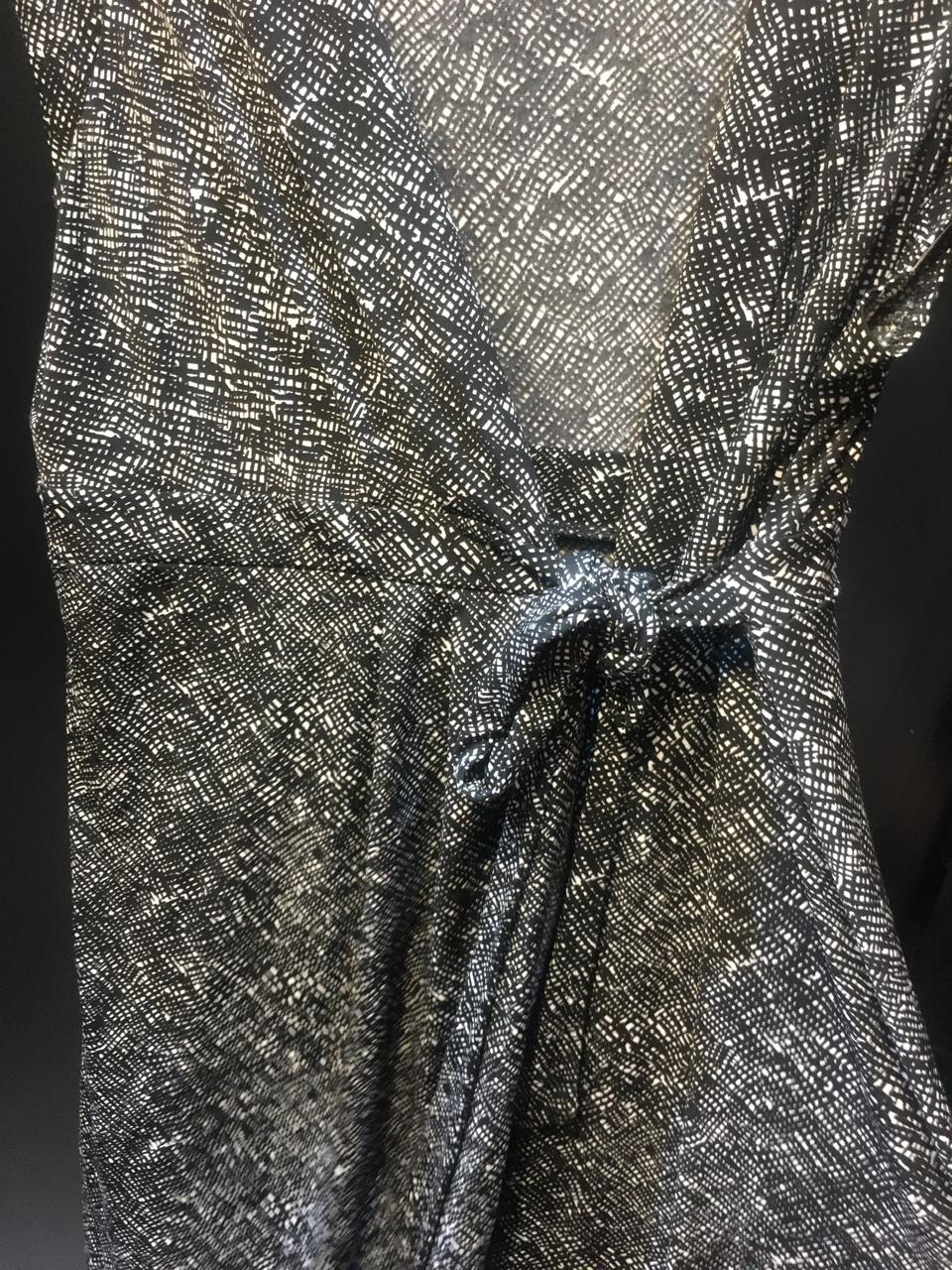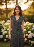 Sleek, stylish, and sophisticated! This sleeveless wrap dress features a chic monochrome print with a flattering tie-waist detail. The deep V-neck adds a touch of elegance, making it perfect for both casual and evening wear. Dress it up with heels or keep it effortless with flats—either way, you'll turn heads!