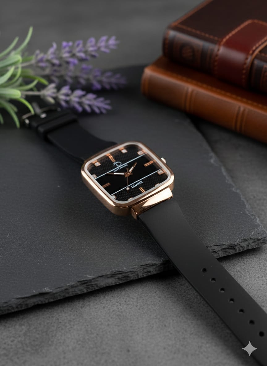 Elegant square-dial watch featuring a rose-gold case, a sleek black strap, and a textured black dial with rose-gold markers. A refined accessory that pairs well with formal or smart-casual outfits.