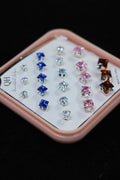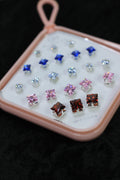 This stunning set of 12 stud earrings is perfect for adding a touch of elegance to any outfit. Featuring a variety of vibrant colors—sparkling clear, bright green, fiery orange, and sleek black—these earrings come in round and square designs to suit any style. Housed in a beautiful display case, they make a thoughtful gift for loved ones or a versatile addition to your own collection.