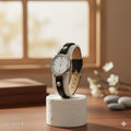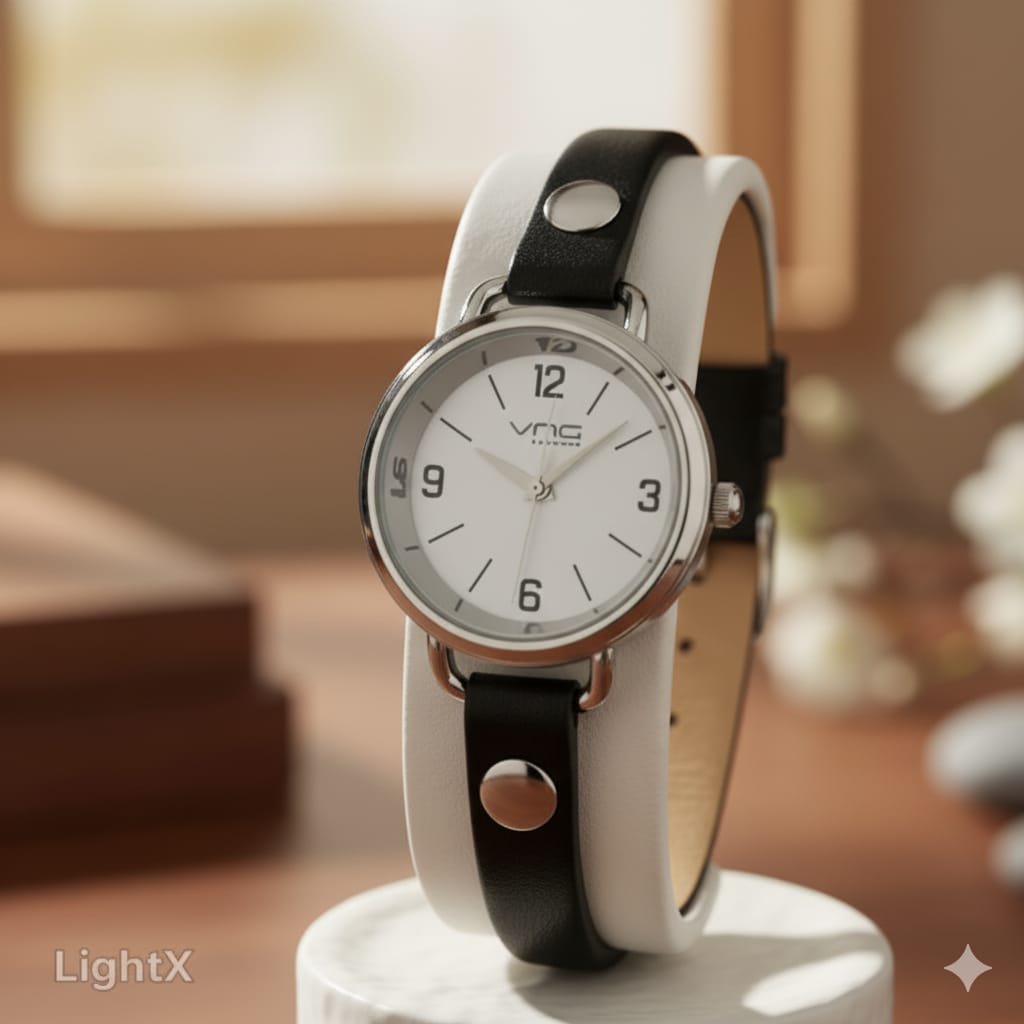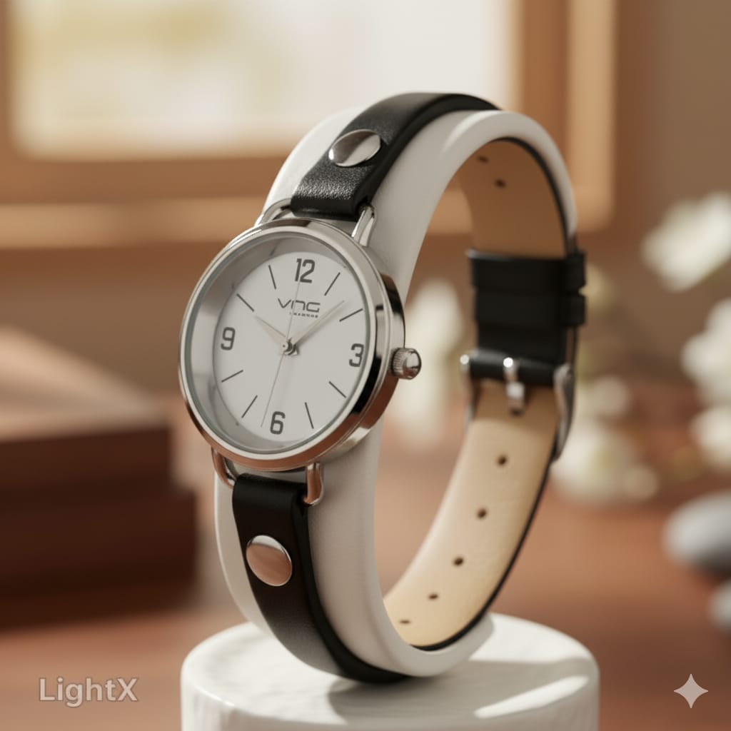 A stylish women’s wristwatch featuring a classic round dial with a clean white face, silver-tone case, and a slim, wraparound black leather strap secured with metallic studs. The minimalist dial includes bold numerals at 12, 3, 6, and 9 with slender markers, offering a timeless and versatile accessory for casual to smart-casual outfits.