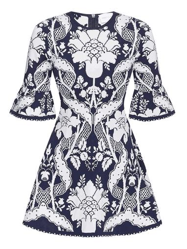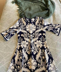 This chic navy blue dress showcases a stunning white floral print, creating a bold and eye-catching contrast. The round neckline and fitted bodice beautifully enhance the figure, while the flared skirt adds a touch of femininity. The three-quarter bell sleeves, adorned with delicate lace-like detailing, bring an extra element of elegance. Perfect for special occasions, brunches, or evening events, this dress combines timeless style with modern sophistication.